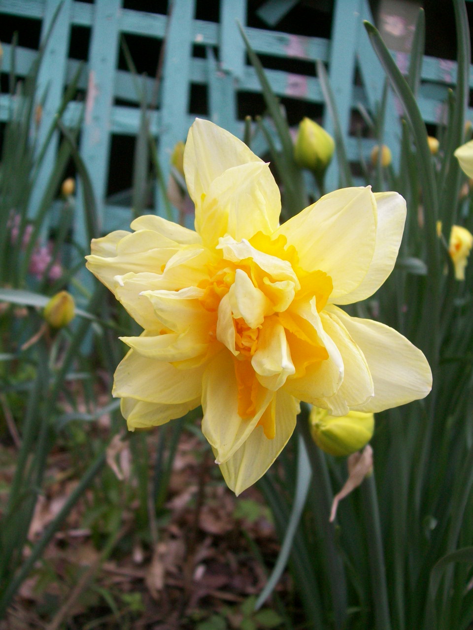 This Spring has been unusual. Not only the deluge,but exceptionally warm weather for April. And for the first time the daffodils I was too lazy to eradicate actually flowered. They look like in the picture, double petaled, and some of them are just a disorganized mess.