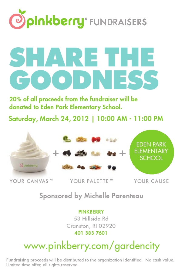 March 13, 2012 Pinkberry Fundraiser for my Daughter’s Elementary School Bring this flyer to Pinkberry in Garden City on March 24 and the Eden Park Elementary School will get 20% for its PTP group. Share this: Click to share on X (Opens in new window) X Click to share on Facebook (Opens in new window) Facebook Click to share on LinkedIn (Opens in new window) LinkedIn Click to print (Opens in new window) Print Click to share on Reddit (Opens in new window) Reddit Click to email a link to a friend (Opens in new window) Email Click to share on Tumblr (Opens in new window) Tumblr Click to share on Pinterest (Opens in new window) Pinterest Click to share on Pocket (Opens in new window) Pocket Like Loading... Related