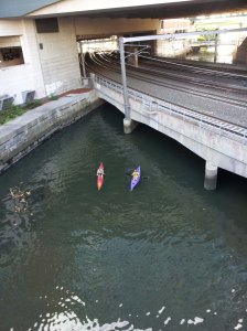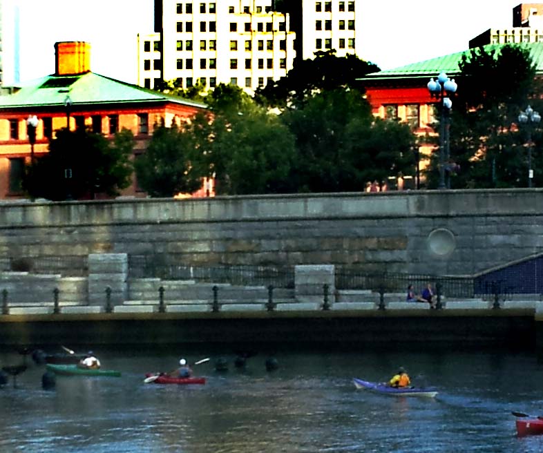 Walking home from work today I saw the kayaks of the inner city, first saw them by the railroad tracks under Providence Place Mall. I think that was the Woonasquatucket River, flowing from the green fields of Olneyville. That looks like fun.