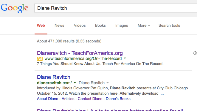 December 7, 2014December 7, 2014 Teach for America on Page One Above the Search Results for “Diane Ravitch” Google Continue reading →